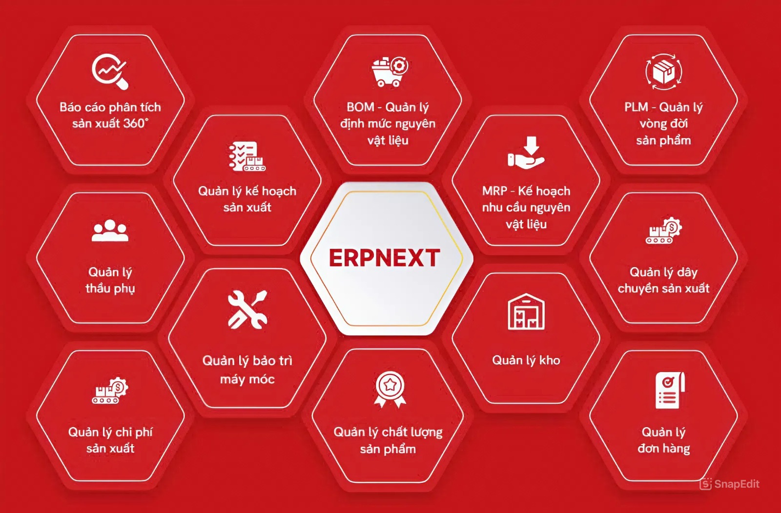 - ✔ Đầy đủ tính năng: BOM, Sản xuất, Nhân sự, Tài chính, Bán hàng,…