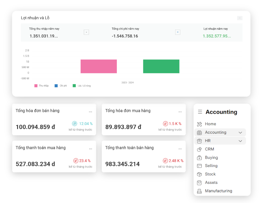 • Bộ công cụ quản trị từ kế toán, mua hàng, bán hàng, kho hàng, nhân sự, CRM,…