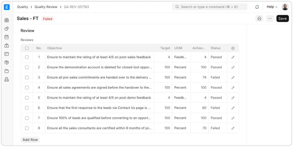 ERPNext hỗ trợ tính năng đánh giá chất lượng sản phẩm, dịch vụ hoặc quy trình theo các tiêu chí / thông số chất lượng đã được xác định trước, và ghi lại kết quả đánh giá đạt (passed) hay không đạt (failed).