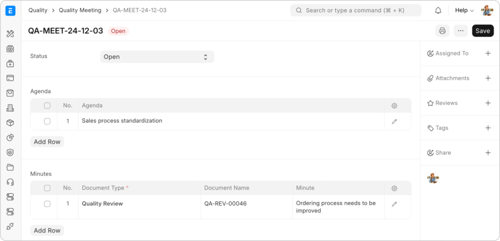 Để đảm bảo các vấn đề chất lượng được xử lý kịp thời, ERPNext cho phép tổ chức các cuộc họp review và thảo luận chất lượng định kỳ, gắn với các phiếu đánh giá chất lượng (quality review). Mỗi cuộc họp sẽ bao gồm người tham gia, vấn đề thảo luận, kết luận sau cuộc họp và các hành động cần thiết để cải thiện chất lượng. Điều này đảm bảo tính trách nhiệm và giúp theo dõi các nhiệm vụ liên quan một cách hiệu quả.
