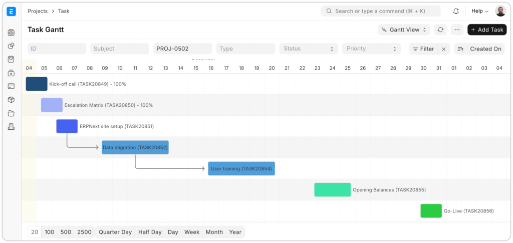 ERPNext giúp doanh nghiệp dễ dàng quản lý tiến độ dự án với hệ thống phân rã công việc thành từng nhiệm vụ cụ thể: